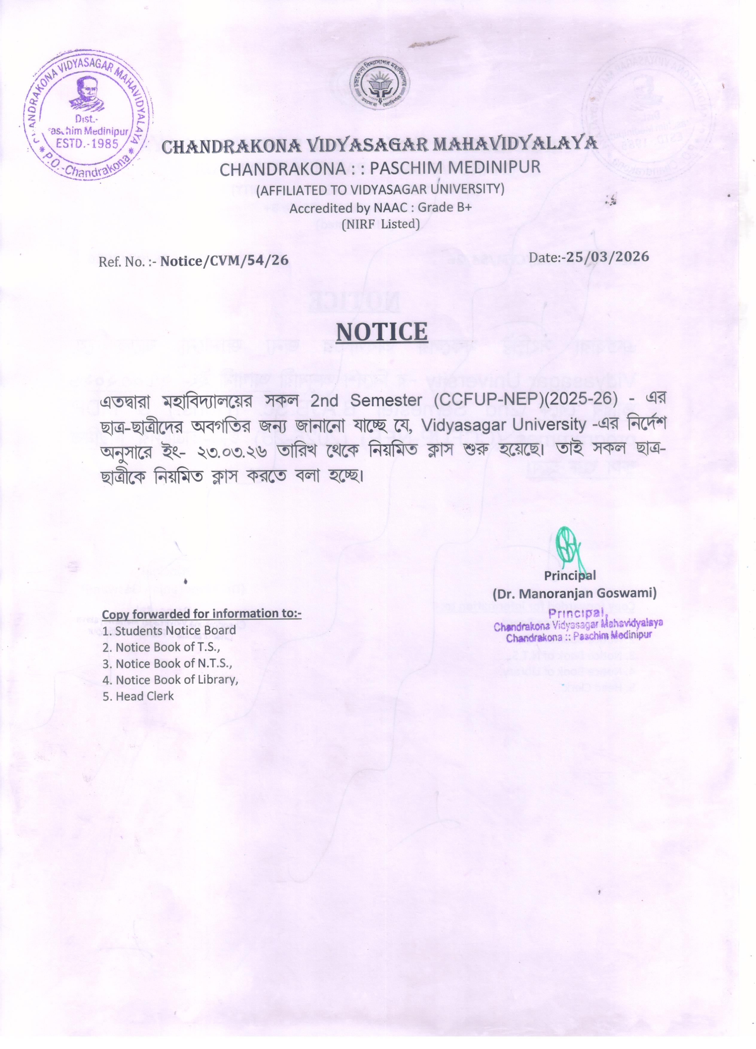 Commencement of 2nd Semester Classes