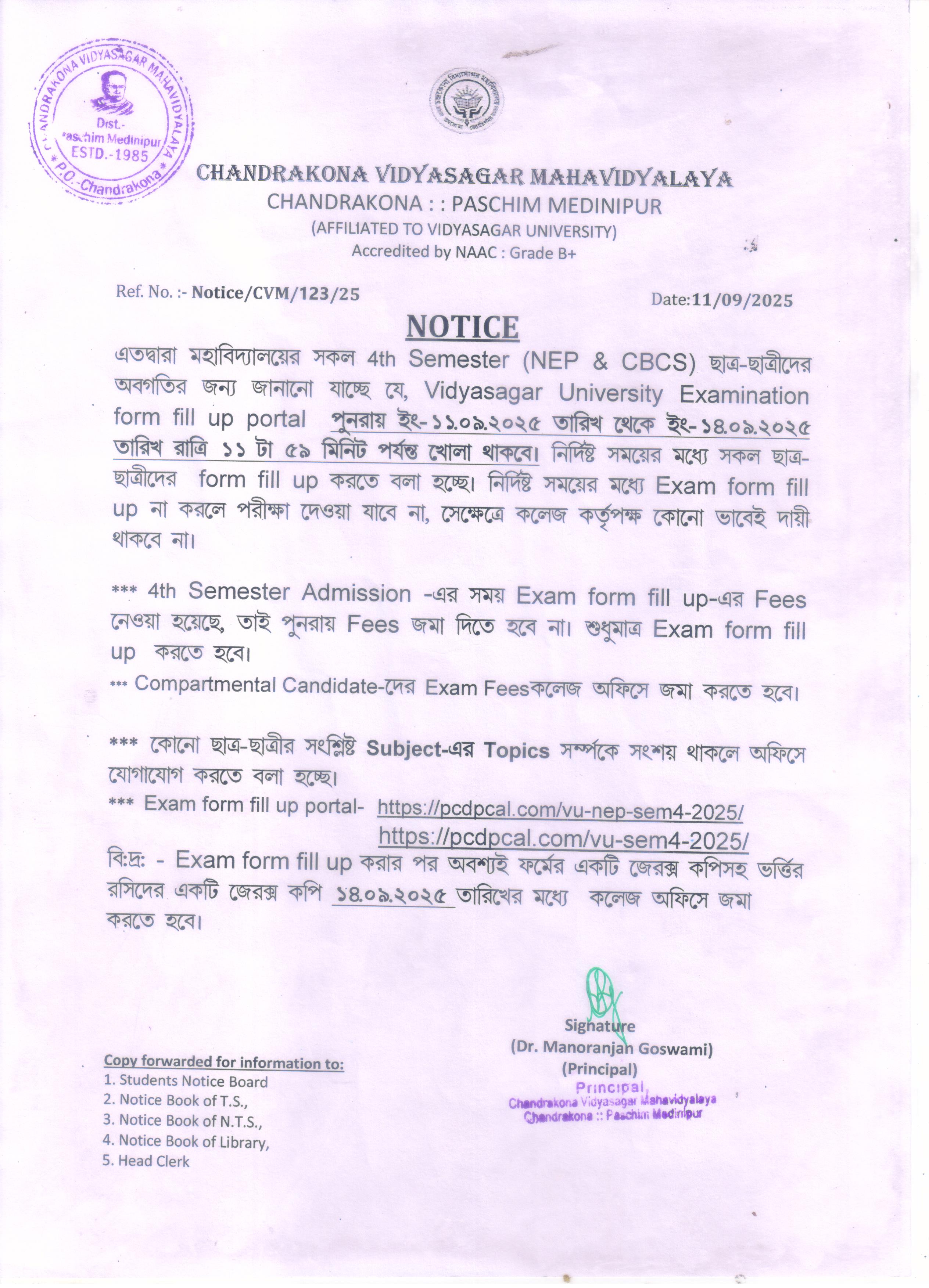 Thursday, September - 11, 2025 Notice: Extension of University Examination Form Fill-Up for 4th Semester Students
