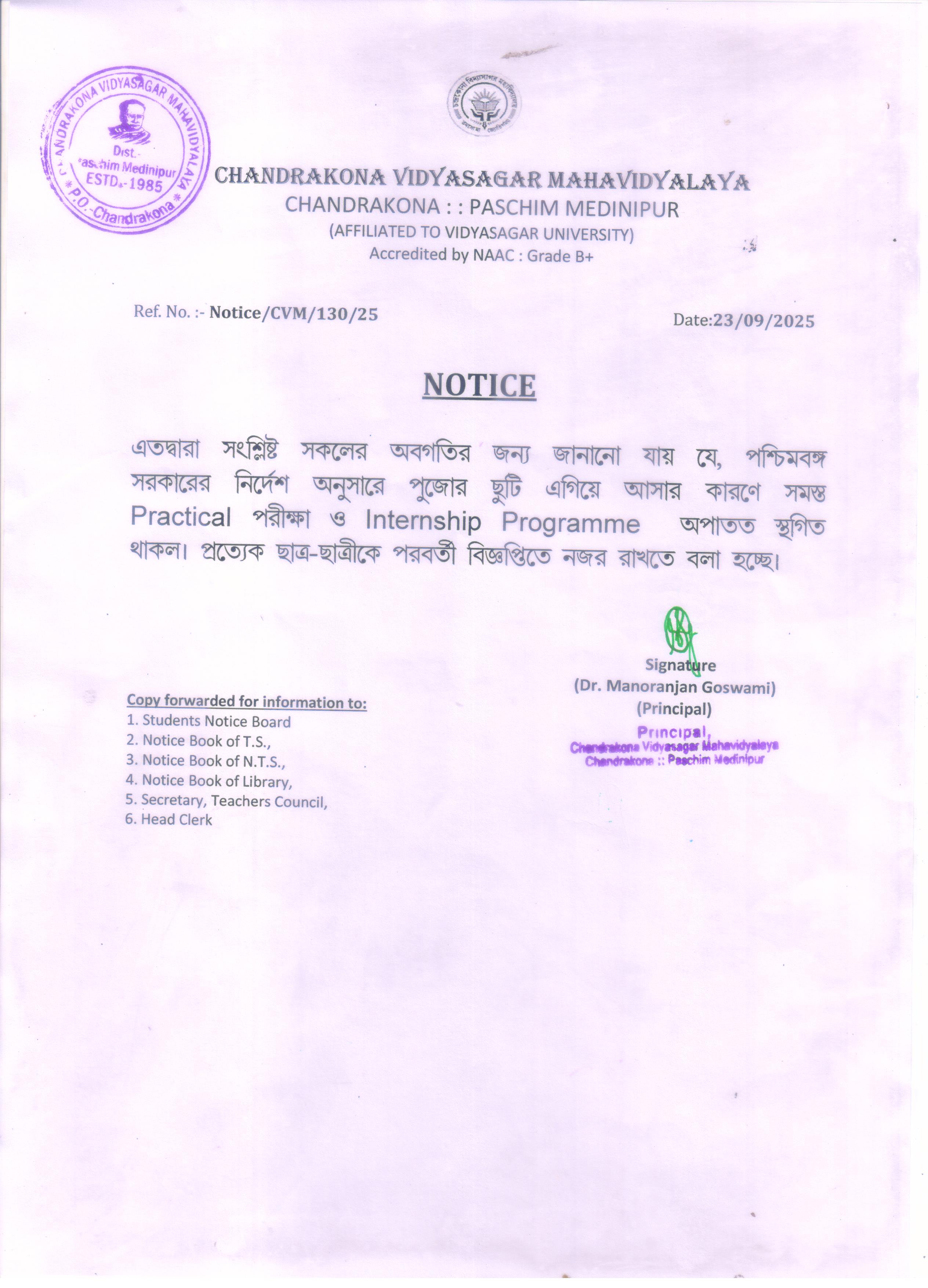 "Postponement of practical exam and internship programme"