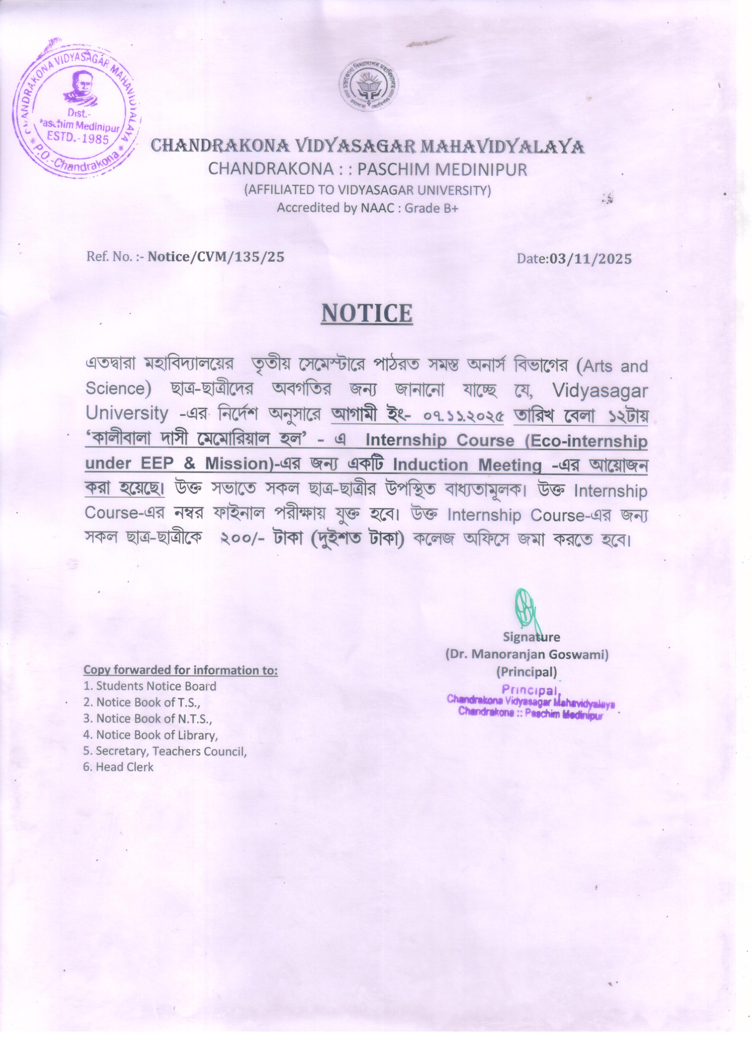 Revised Induction Meeting Schedule for 3rd Semester Students