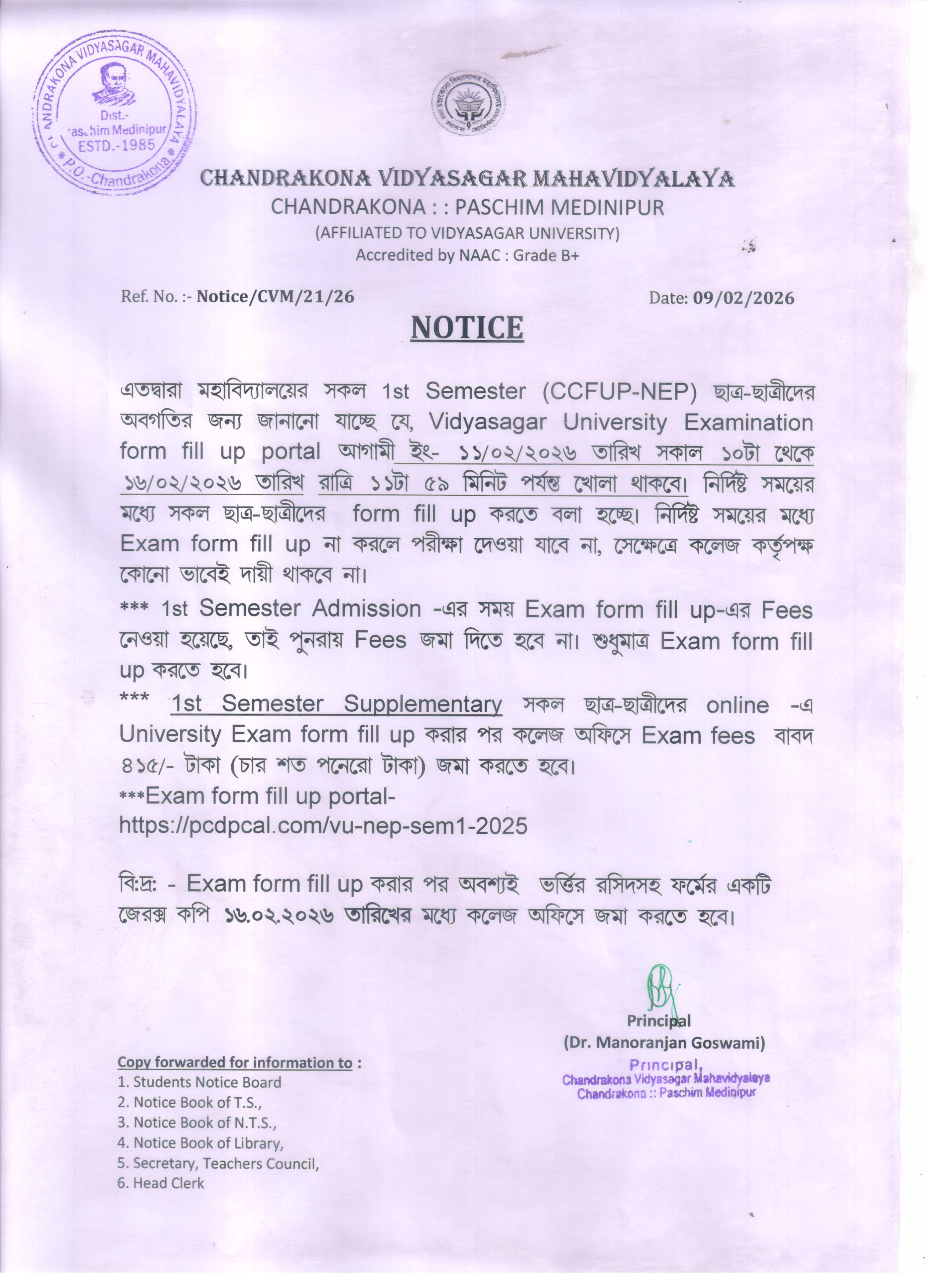 Notice for 1st Semester for University Exam. form fill up