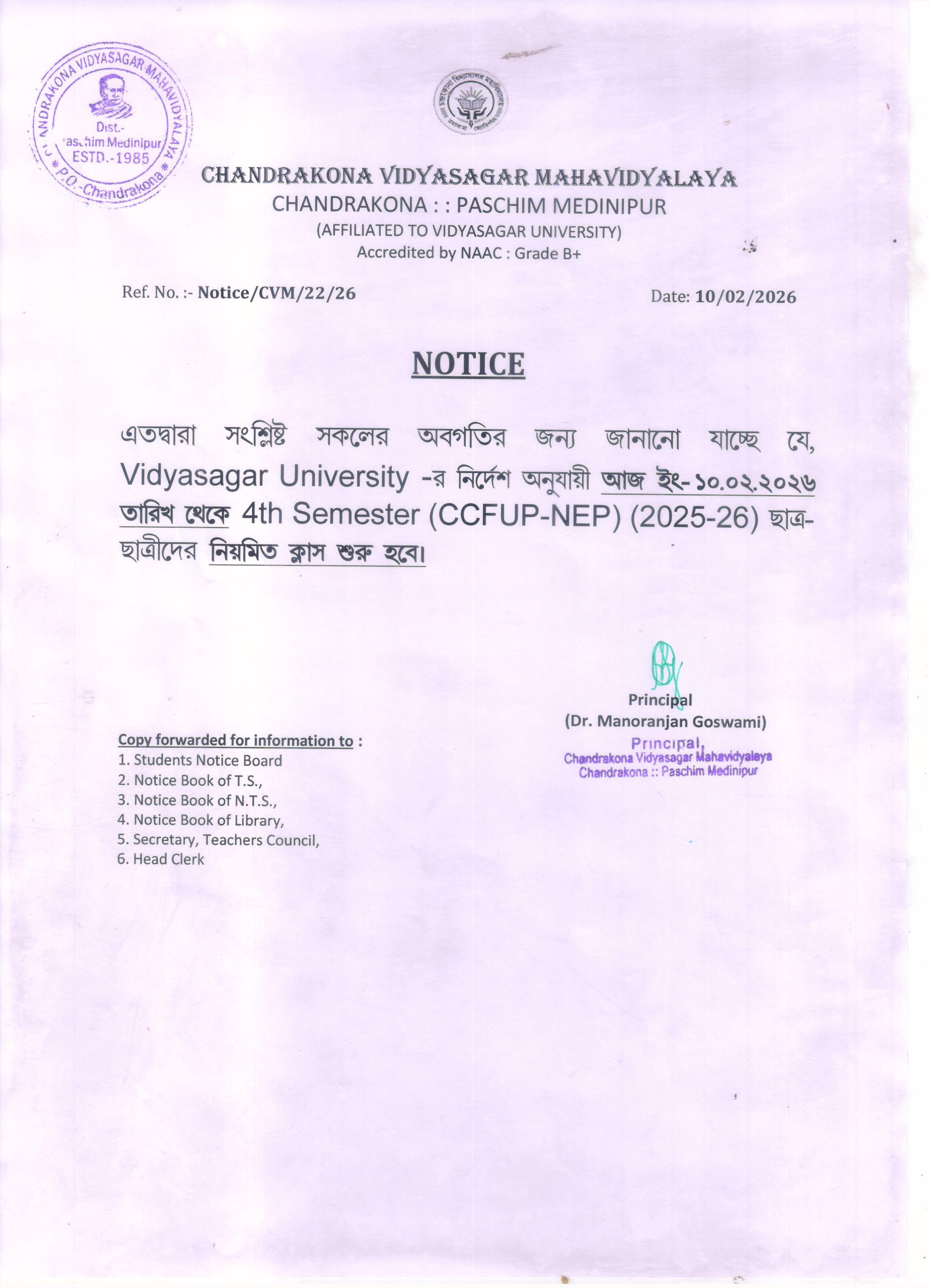 Notice Regarding Commencement of the 4th Semester