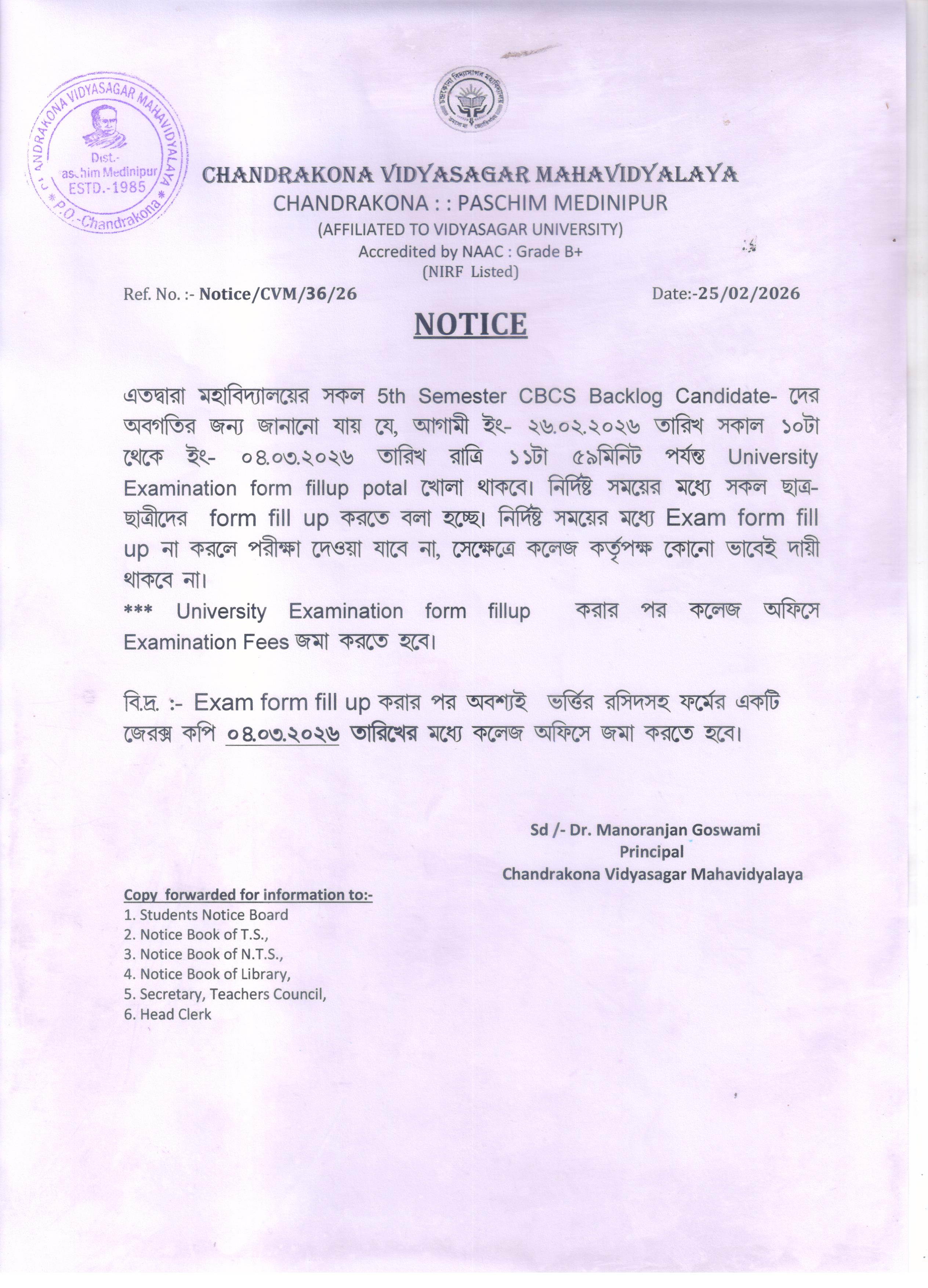 Backlog CBCS _5th Semester University Examination form fillup