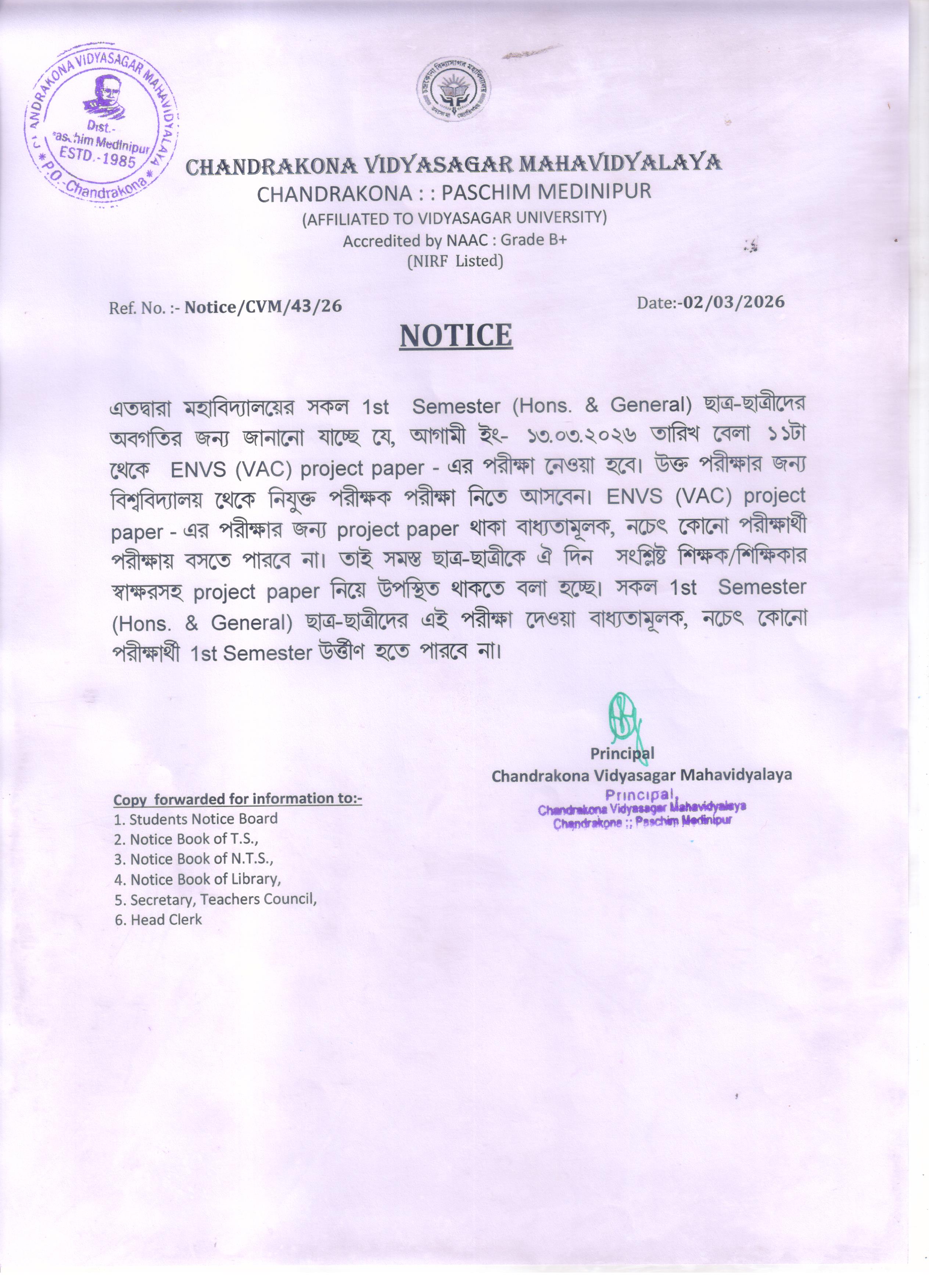 Notice for 1st Semester Students regarding ENVS (VAC) Exam
