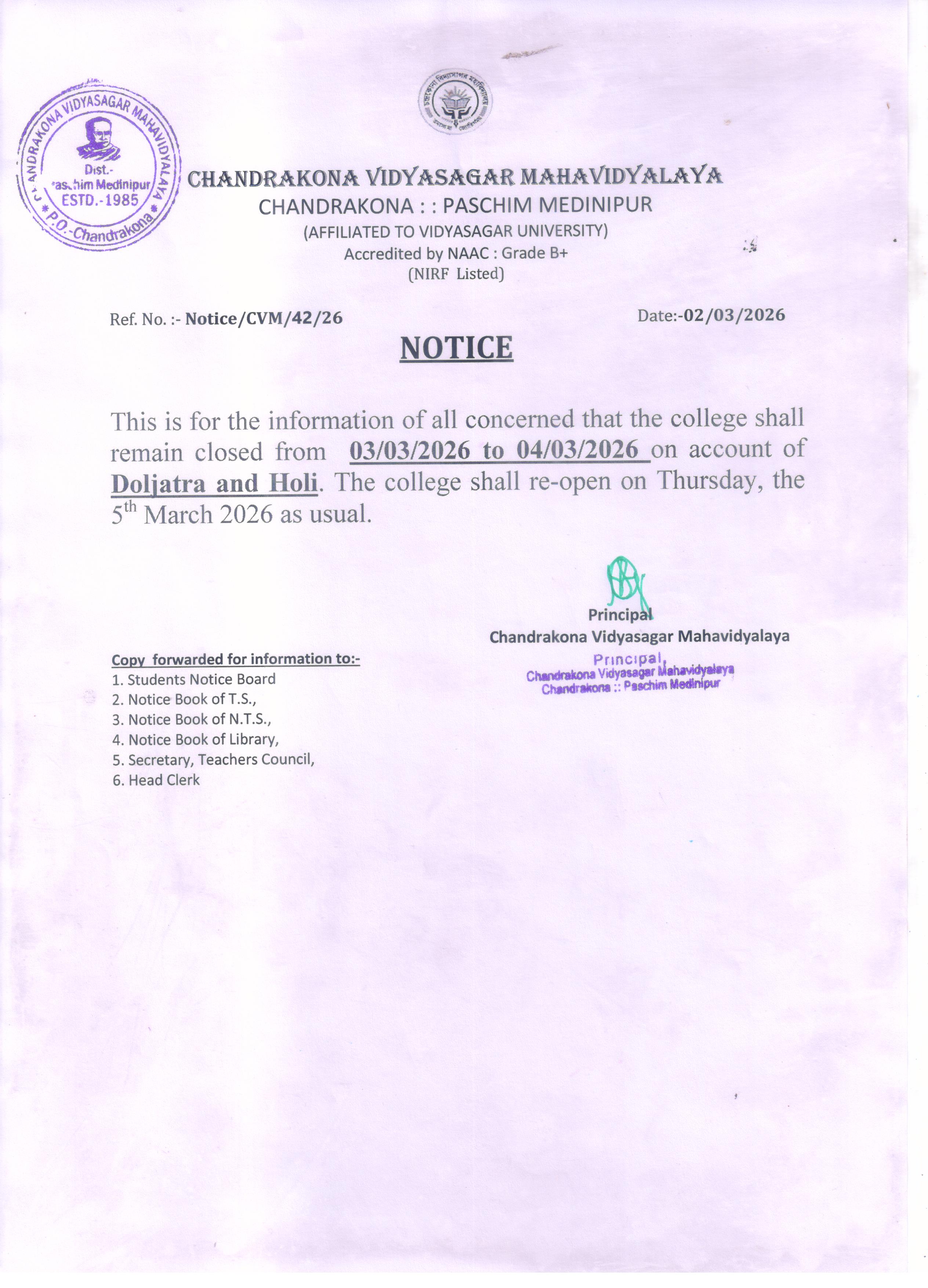 Notice for 5th Semester Students regarding Internal Assessment