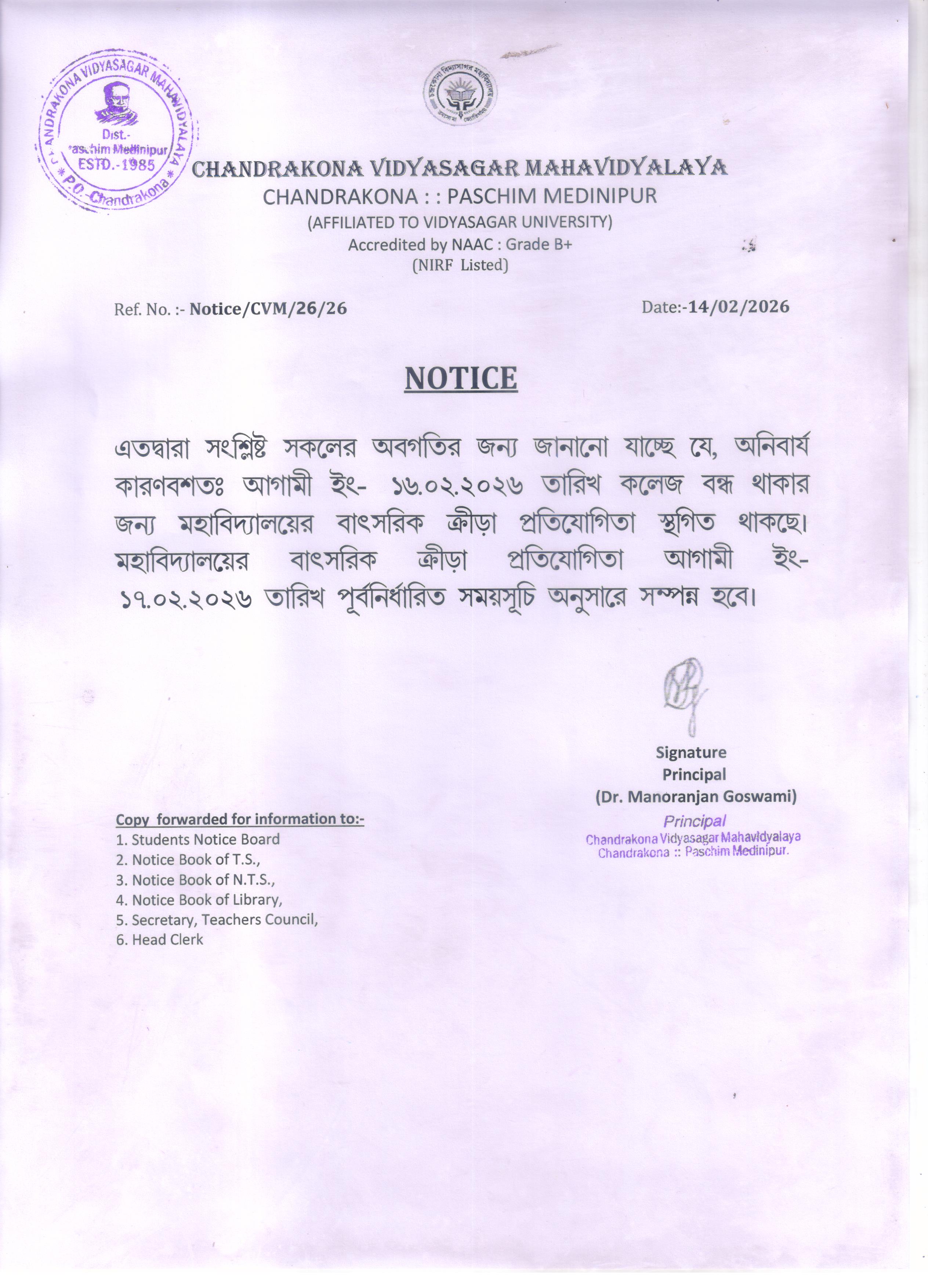 Notification Regarding Holiday on the Birthday of Thakur Panchanan Barma