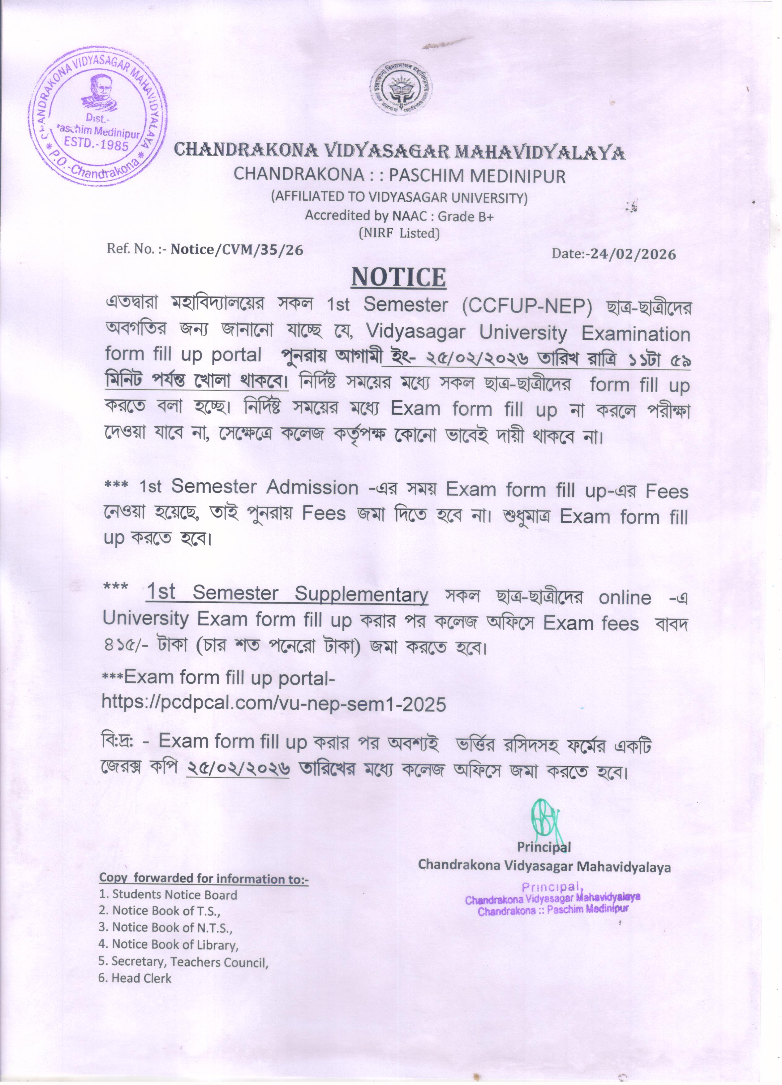 2nd time extension of 1st semester university exam form fill up