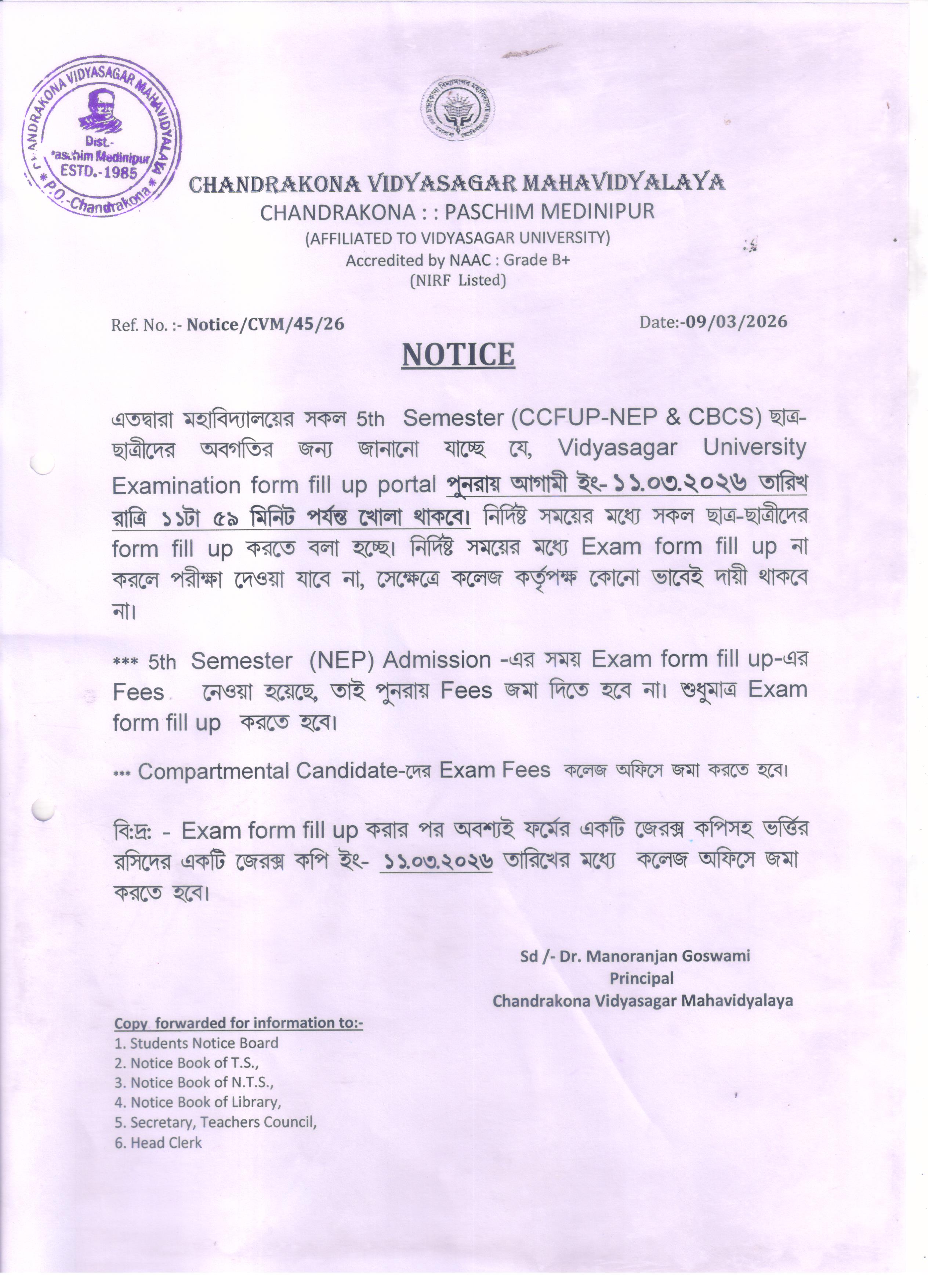 “Notice for Extension of UG 5th Semester Examination Form Fill-Up”