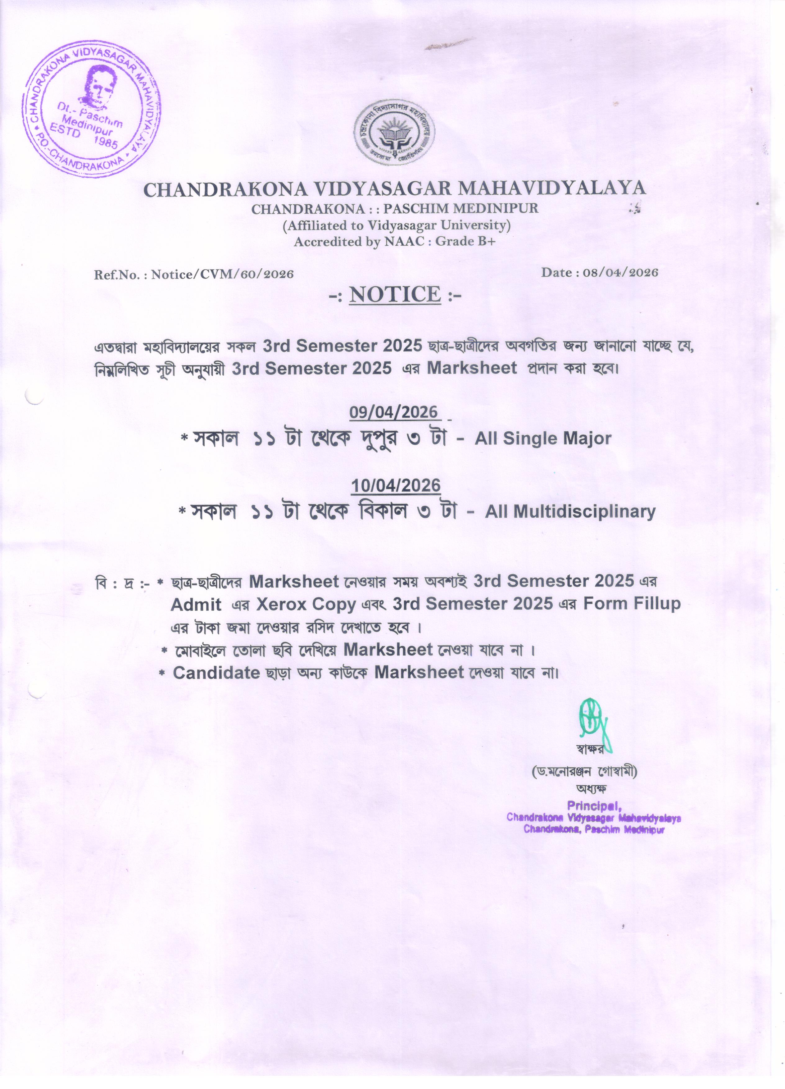 Notice for 3rd Semester for Marksheet distribution